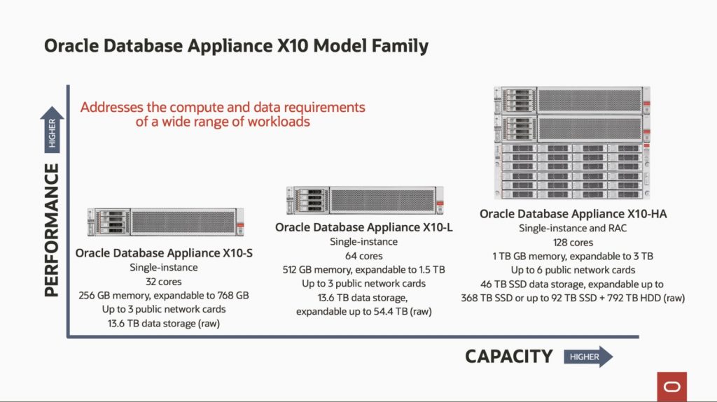 A nova versão do Oracle Database Appliance (X10) vem equipado com mais núcleos de CPU, maior capacidade de memória e armazenamento, consequentemente melhor desempenho geral a preços semelhantes aos sistemas da geração anterior. Isso permite executar mais cargas de trabalho de bancos de dados Oracle em menos tempo e com menos infraestrutura como nunca visto antes. O Oracle Database Appliance X10 continua a fornecer a plataforma mais fácil e acessível na qual organizações de qualquer tamanho podem executar bancos de dados Oracle e aplicativos.
